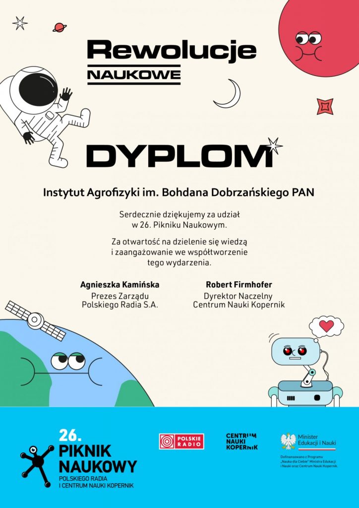 W dniu 27 maja 2023 roku w godz. 11:00-20:00 Instytut Agrofizyki im. Bohdana Dobrzańskiego PAN w Lublinie uczestniczył w 26. Pikniku Naukowym Polskiego Radia i Centrum Nauki Kopernik w Warszawie, który odbył się na Stadionie Narodowym PGE Narodowy. Piknik Naukowy to wielkie święto nauki, które odbywa się corocznie od 26 lat, wstęp jest bezpłatny. Każda edycja imprezy ma inne hasło przewodnie, określające tematykę wszystkich atrakcji – pokazów, warsztatów, dyskusji, spotkań. Tematem przewodnim tegorocznej imprezy było hasło Rewolucje Naukowe. Podczas imprezy teren wokół PGE Narodowego zajmują namioty, w których można oglądać pokazy i samodzielnie robić różne eksperymenty naukowe. Każdy namiot to inne stanowisko. Ich gospodarzami są naukowcy, studenci, przedstawiciele instytucji zajmujących się działalnością badawczą i popularyzujących naukę. W programie tej edycji znalazło się wiele pokazów i prezentacji, które zachwyciły dzieci – na specjalnej scenie naukowcy z różnych krajów prowadzili pokazy naukowe na najwyższym, światowym poziomie, poza tym eksperymenty, pokazy i ciekawe rozmowy odbywały się na licznych stanowiskach przygotowanych przez różne instytucje naukowe. Organizatorzy przygotowali też Strefę Rodzinną dla przedszkolaków i młodszych uczniów szkół podstawowych, na których czekało wiele aktywności związanych z nauką i poznawaniem świata. Piknik odwiedza średnio ok. 50 000 osób.