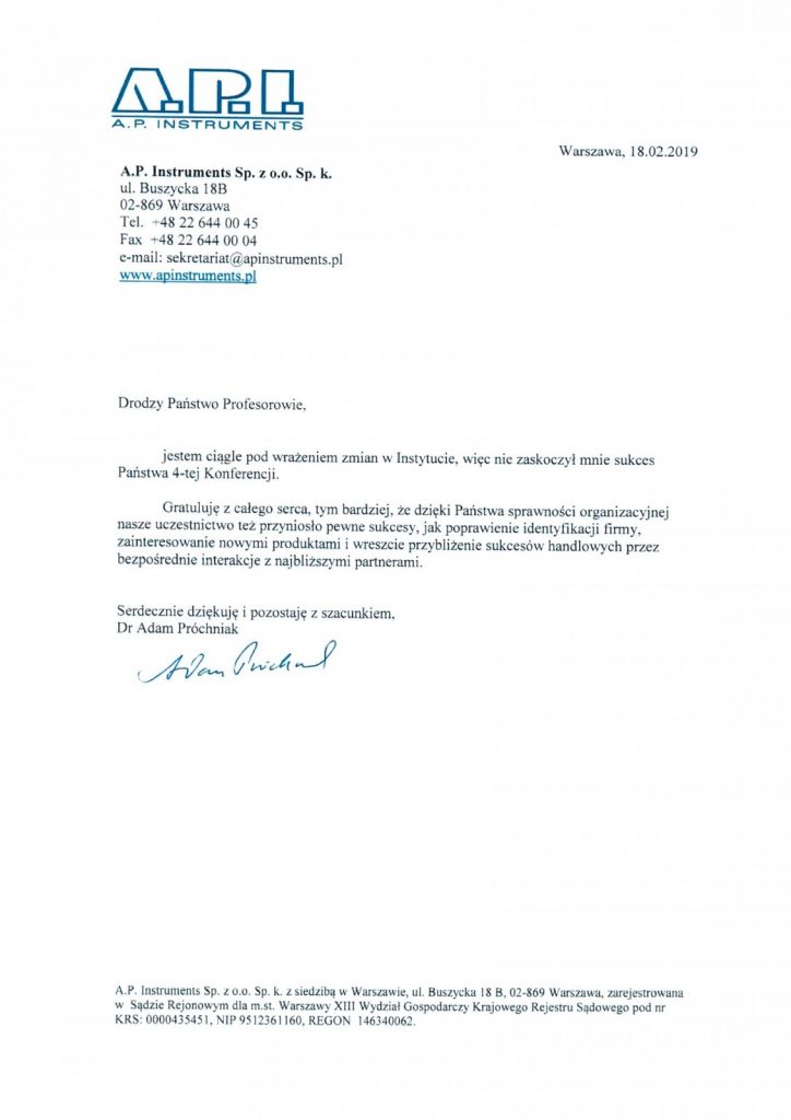 Poniżej znajdziecie Państwo list dr Adama Próchniaka z firmy A.P. Instruments.