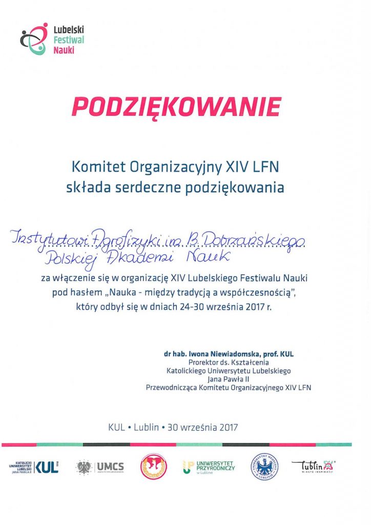 W dniach 24-30 września 2017 roku odbył się po raz czternasty Lubelski Festiwal Nauki. Głównym organizatorem tegorocznego Festiwalu, którego hasło brzmiało Nauka – między tradycją a współczesnością, był Katolicki Uniwersytet Lubelski Jana Pawła II.
