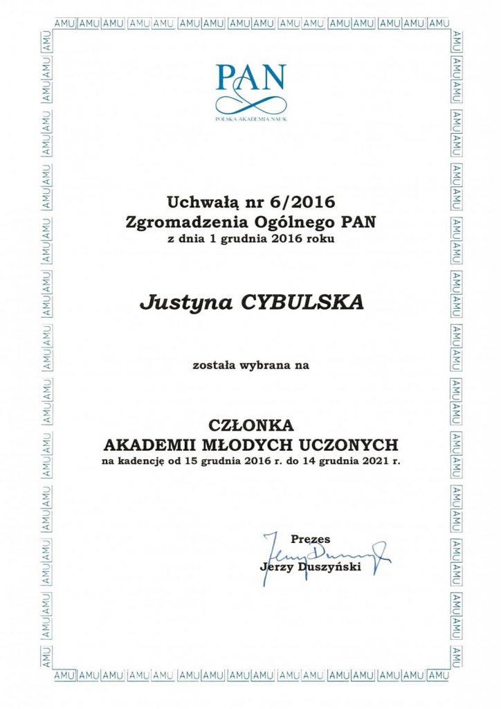 Miło nam poinformować, że dr hab. inż. Justyna Cybulska została wybrana na członka Akademii Młodych Uczonych Polskiej Akademii Nauk w Wydziale II Nauk Biologicznych i Rolniczych PAN, zgodnie z Uchwałą nr 6/2016 Zgromadzenia Ogólnego Polskiej Akademii Nauk z dn. 1 grudnia 2016 r.
