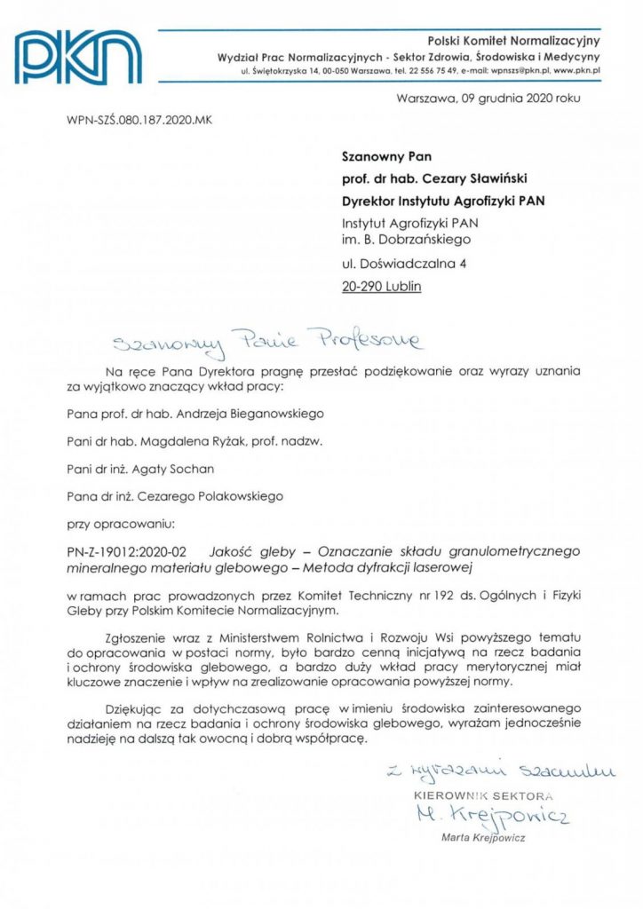 Polish Committee for Standardization (PKN) has sent words of appreciation for the exceptionally significant work done by Prof. Andrzej Bieganowski, Assoc. Prof. Magdalena Ryżak, EngD Agata Sochan, and EngD Cezary Polakowski in preparing a publication PN-Z-19012:2020-02 Jakość gleby: oznaczanie składu granulometrycznego mineralnego materiału glebowego: metoda dyfrakcji laserowej in the frame of a task carried out by the Technical Committee No. 192 on General Affairs and Soil Physics at the PKN.