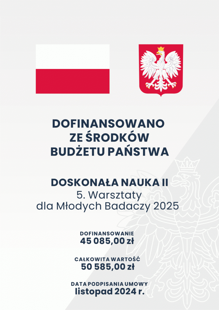 Projekt pt. 5. Warsztaty dla Młodych Badaczy 2025 dofinansowany jest ze środków budżetu państwa, przyznanych przez Ministra Nauki i Szkolnictwa Wyższego w ramach Programu „Doskonała Nauka II”
