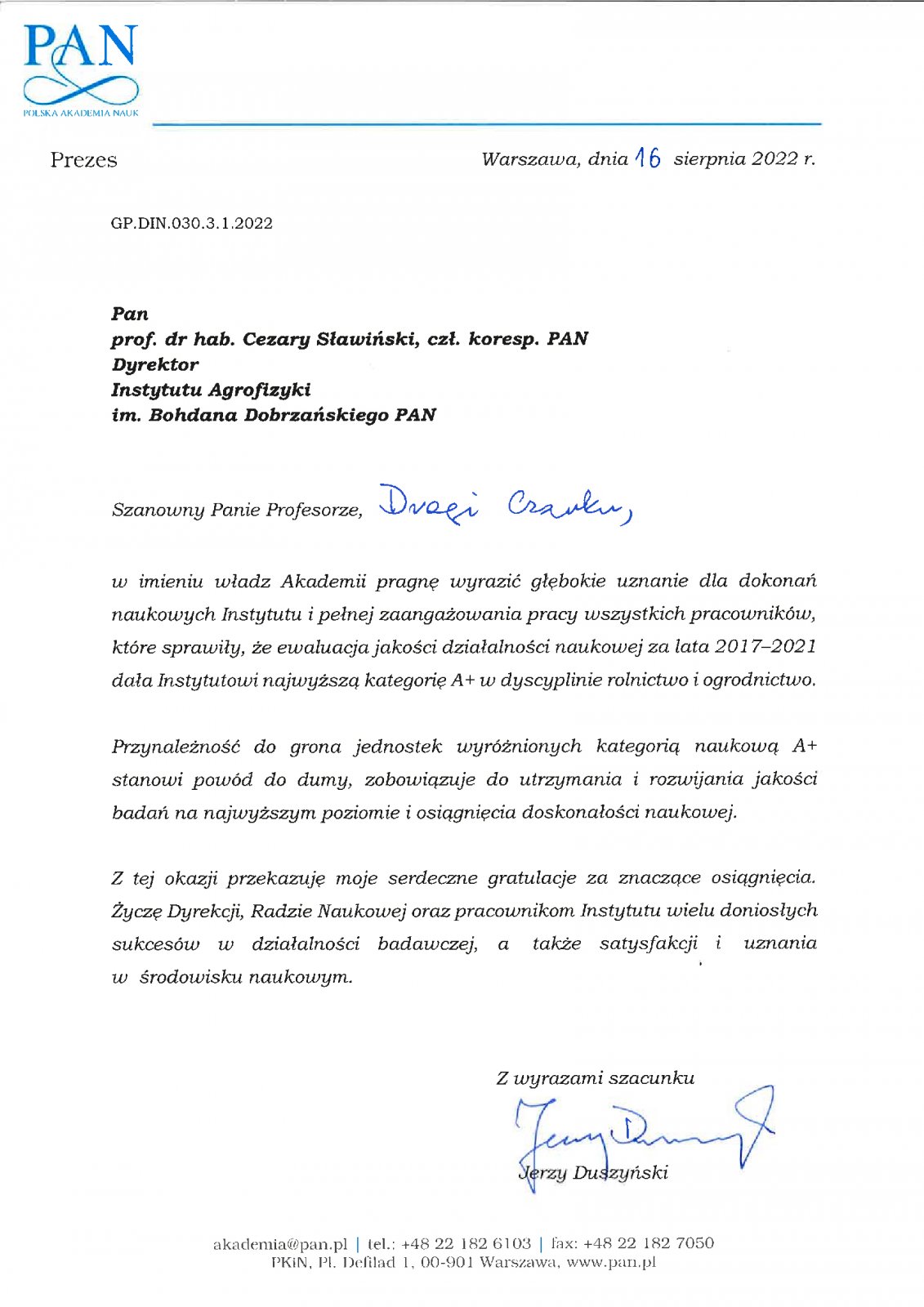 Miło nam poinformować, że w wyniku przeprowadzonej ewaluacji przez Ministerstwo Edukacji i Nauki za lata 2017-2021, Instytut Agrofizyki PAN otrzymał kategorię A+ w dyscyplinie rolnictwo i ogrodnictwo.