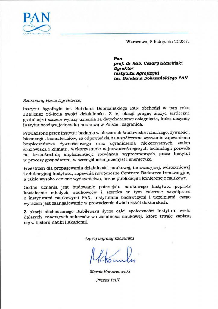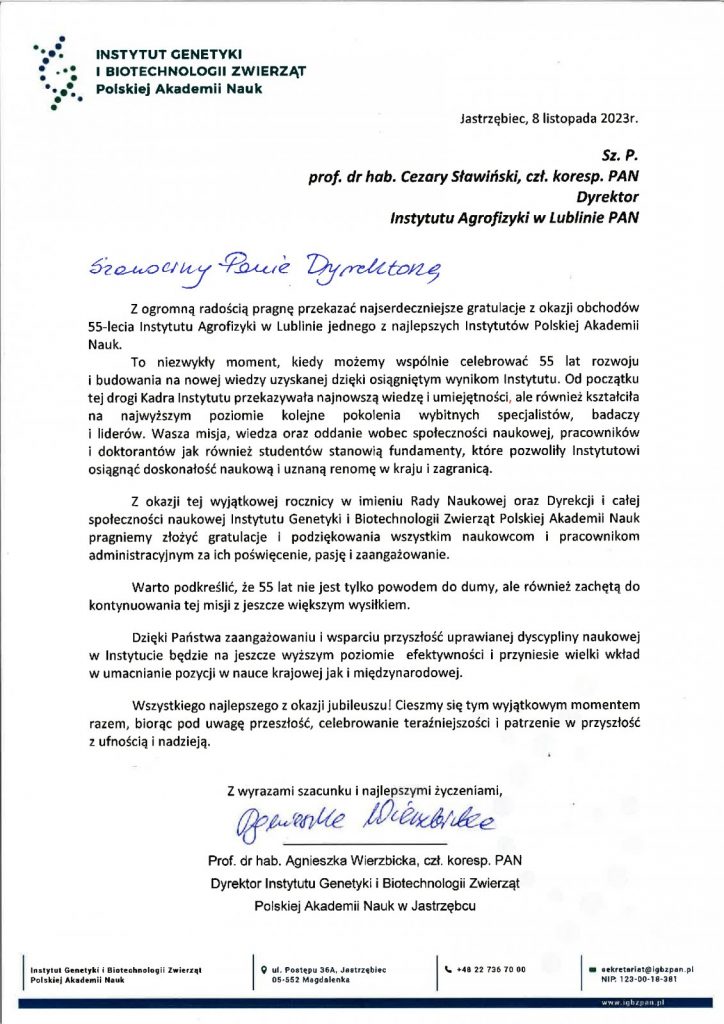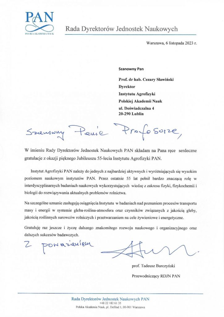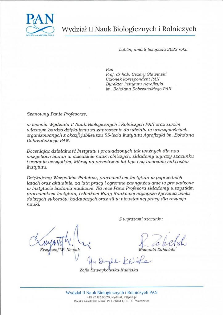 W 2023 r. Instytut Agrofizyki PAN w Lublinie obchodzi 55. rocznicę swego powstania. Z tej okazji w dniach 8-9 listopada 2023 r. odbyły się w Instytucie Agrofizyki PAN jesienne wyjazdowe Zebranie Plenarne Wydziału II Nauk Biologicznych i Rolniczych PAN oraz Posiedzenie Rady Kuratorów Wydziału II PAN.