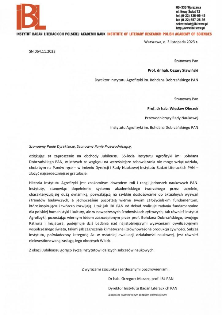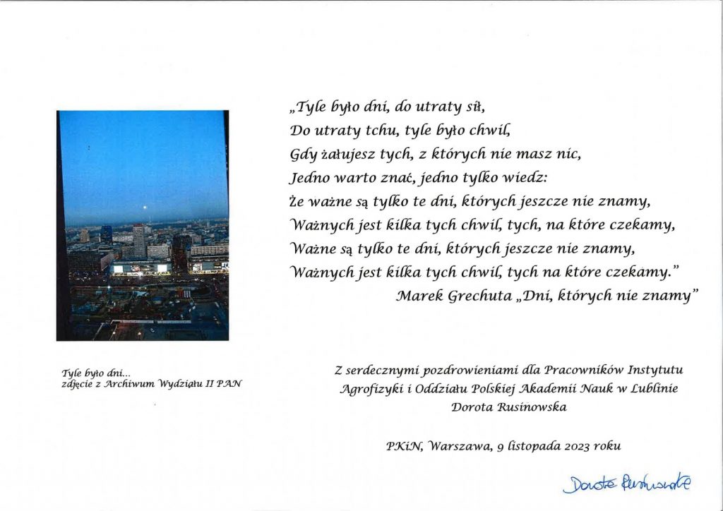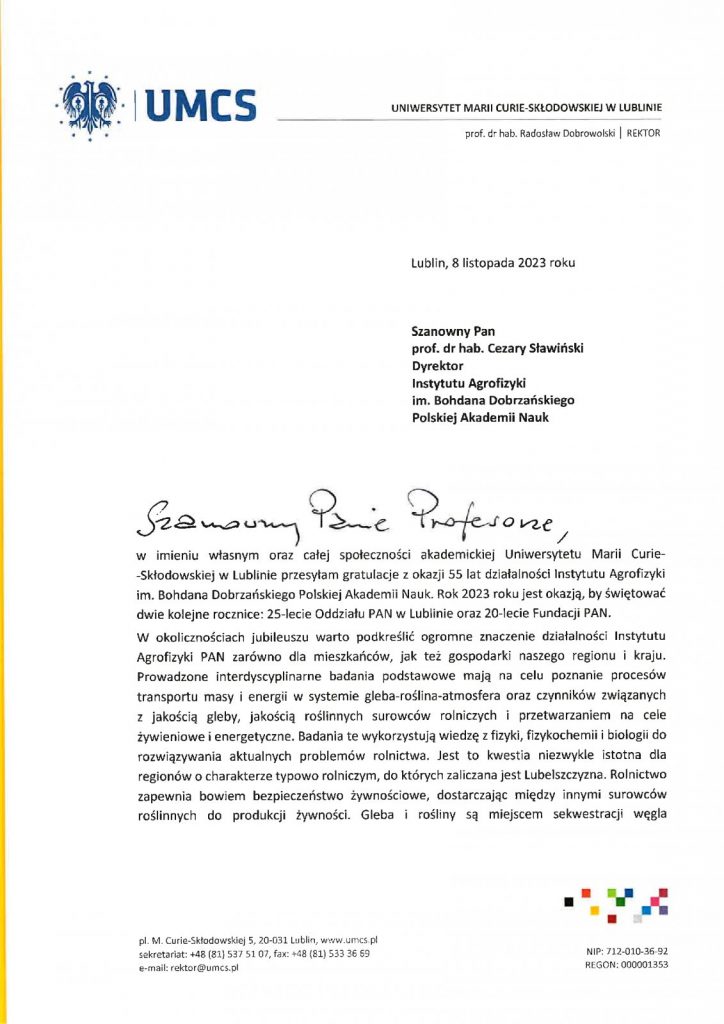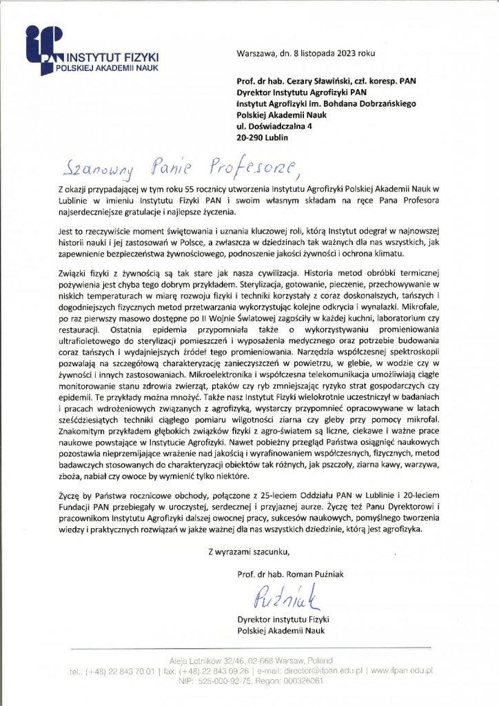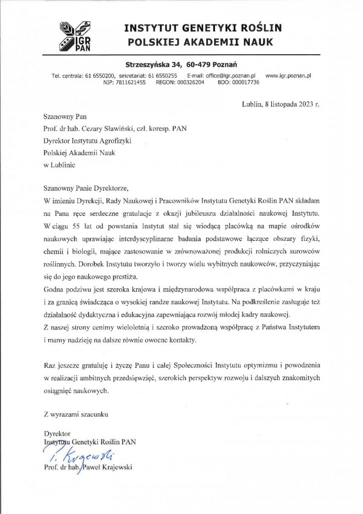 W 2023 r. Instytut Agrofizyki PAN w Lublinie obchodzi 55. rocznicę swego powstania. Z tej okazji w dniach 8-9 listopada 2023 r. odbyły się w Instytucie Agrofizyki PAN jesienne wyjazdowe Zebranie Plenarne Wydziału II Nauk Biologicznych i Rolniczych PAN oraz Posiedzenie Rady Kuratorów Wydziału II PAN.