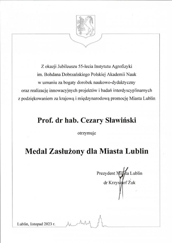 - Postanowieniem z dnia 13 lipca 2023 r. Pan prof. dr hab. Andrzej Bieganowski odznaczony został złotym krzyżem zasługi.