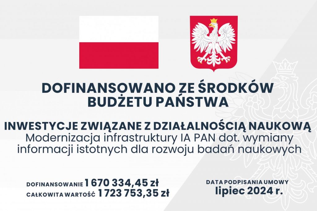 Miło nam poinformować, że zakończyliśmy realizację projektu Ministerstwa Nauki i Szkolnictwa Wyższego pt. „Modernizacja infrastruktury IA PAN dot. wymiany informacji istotnych dla rozwoju badań naukowych” w ramach Programu „Inwestycje Związane z Działalnością Naukową”.