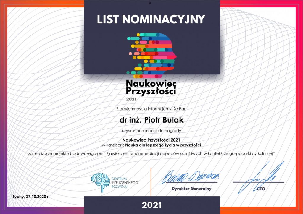 - dr inż. Piotr Bulak za realizację projektu badawczego pn. “Zjawisko entomoremediacji odpadów uciążliwych w kontekście gospodarki cyrkularnej”.