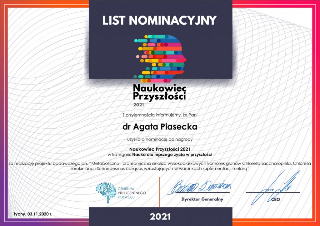 - dr Agata Piasecka uzyskała za realizację projektu badawczego pn. “Metaboliczna i proteomiczna analiza wysokobiałkowych komórek glonów Chlorella saccharophila, Chlorella sorokiniana i Scenedesmus obliquus wzrastających w warunkach suplementacji melasą”, natomiast