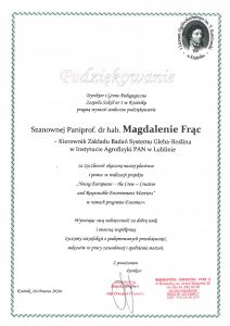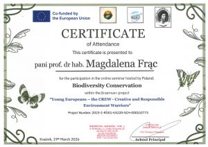 I Liceum Ogólnokształcące im. T. Kościuszki w Kraśniku w ramach programu Erasmus+ zorganizowało seminarium online pt. „Biodiversity Conservation”, podczas którego pani prof. Magdalena Frąc, czł. koresp. PAN miała okazję promować prowadzone w Instytucie Agrofizyki PAN projekty: