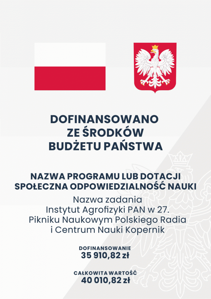 Udział Instytut Agrofizyki PAN w 27. Pikniku Naukowym Polskiego Radia i Centrum Nauki Kopernik był dofinansowany ze środków budżetu państwa, przyznanych przez Ministra Nauki i Szkolnictwa Wyższego w ramach Programu Społeczna Odpowiedzialność Nauki.